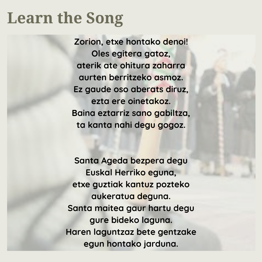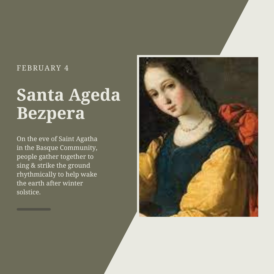 Come on down to the Basque Block on Thursday, February 8 to celebrate Agate Deuna – Santa Ageda – Saint Agatha! We’ll be meeting at 6pm in the Basque Center to learn a bit more about the festivity and practice the song. At 6:30, we’ll move out onto the Block to sing songs in honor of the saint.