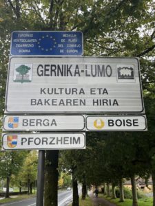 The etching was the design for the poster for the 1989 “Pakea Orain eta Betirako” demonstration in Bilbao, in favour of ETA’s non-violence. Furthermore, the design of this etching appears on the main traffic sign of Gernika, where, in addition to said etching , the three sister cities appear: Berga, Pforzheim and Boise.